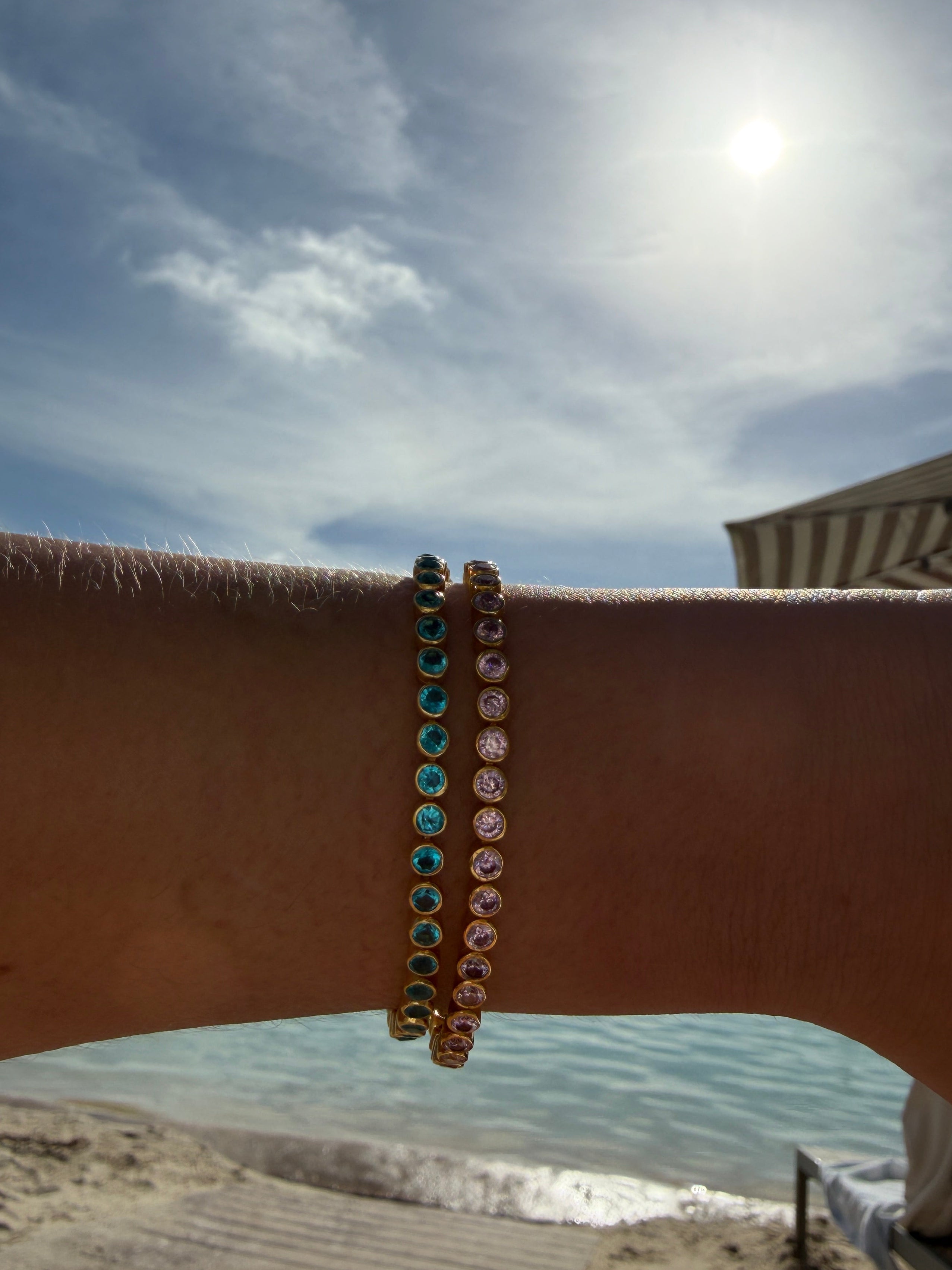 Available in white, pink, green, blue, and yellow stones, this piece is perfect on its own or stacked with each other.