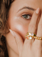 The Wild Bangle Ring is bold, colorful, and unapologetically fearless. Adorned with vibrant multicolor cubic zirconia stones, it brings instant joy and confidence to any look. Wear it solo to let it shine or stack it with other rings for a playful, statement mix. Crafted from 925 sterling silver and finished with 14k gold vermeil for a radiant, lasting glow.