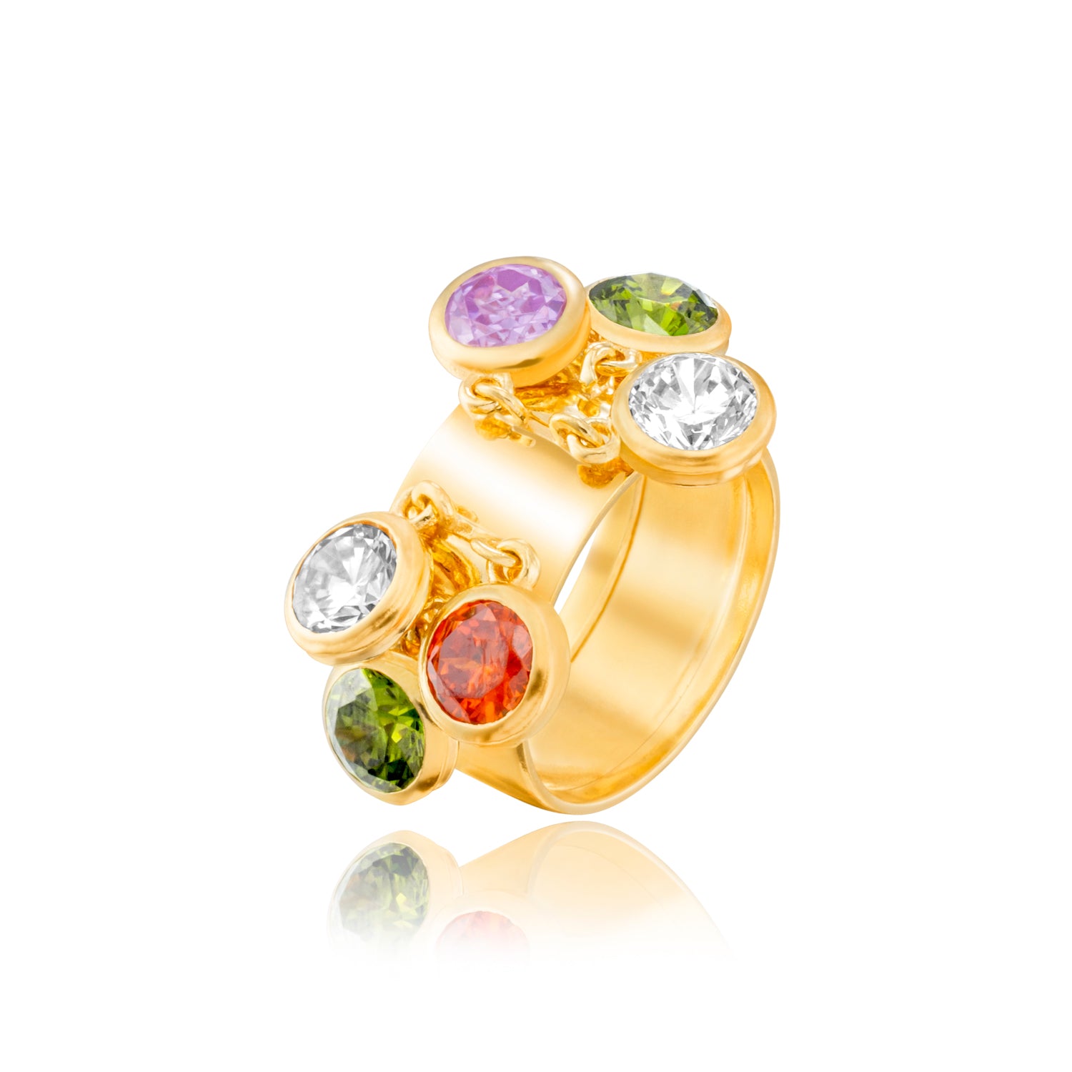 The Wild Bangle Ring is bold, colorful, and unapologetically fearless. Adorned with vibrant multicolor cubic zirconia stones, it brings instant joy and confidence to any look. Wear it solo to let it shine or stack it with other rings for a playful, statement mix. Crafted from 925 sterling silver and finished with 14k gold vermeil for a radiant, lasting glow.